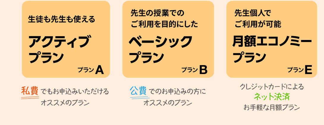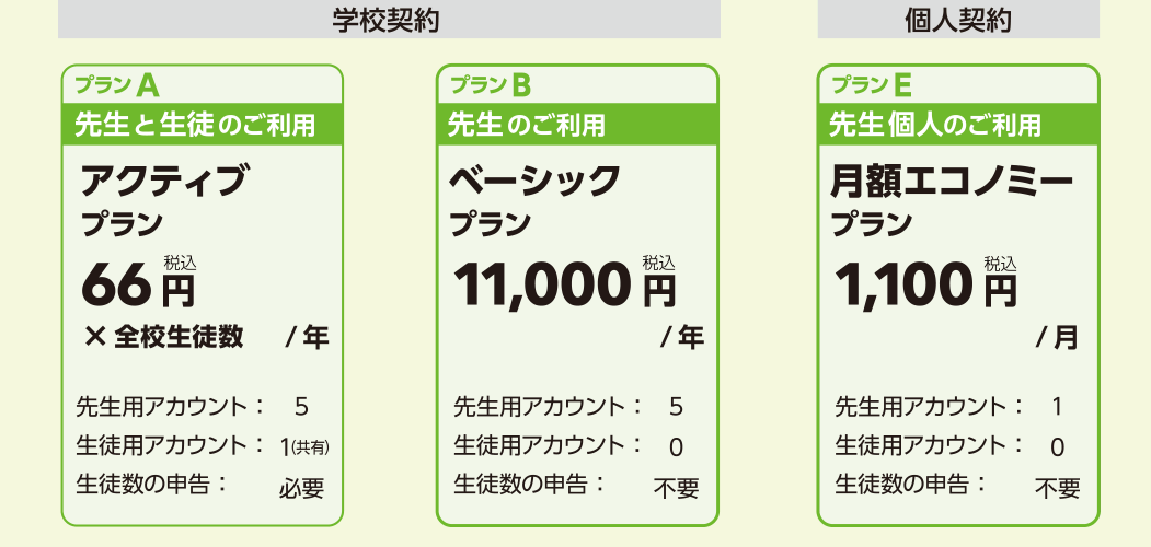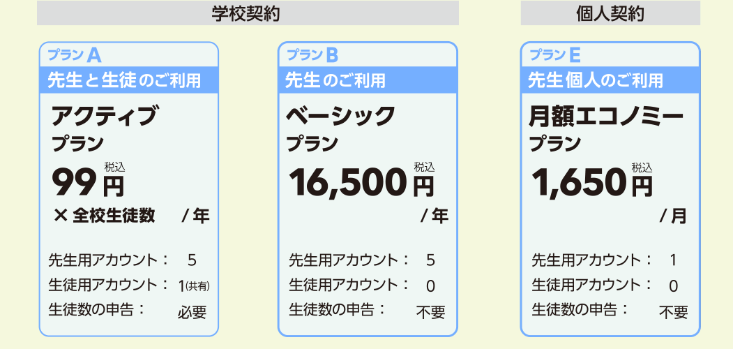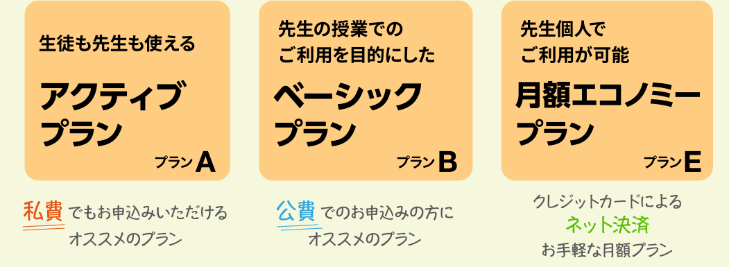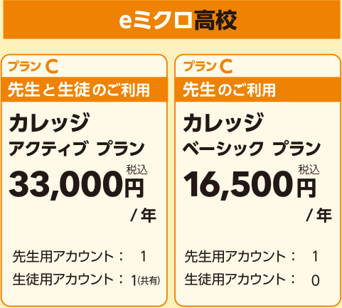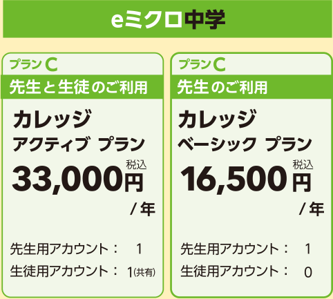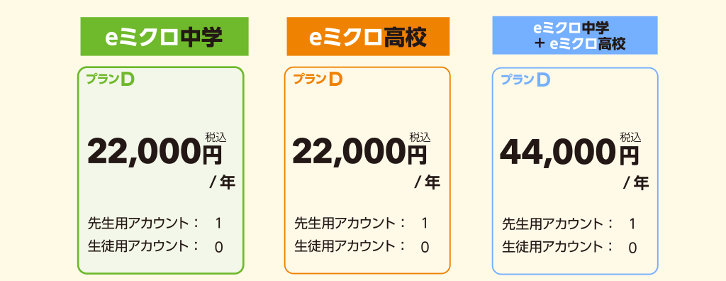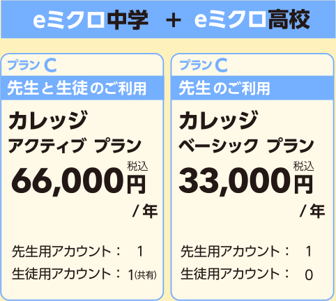 eミクロには、「eミクロ中学」と「eミクロ高校」という2種類の教材があります。 ご利用プランは、「中学校」と「高等学校」向けプラン、 または「その他の教育施設」、「企業」向けのプランを提供しています。